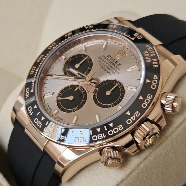 El Daytona más elegante con correa de piel. Oro rosa, dial negro y pura distinción.