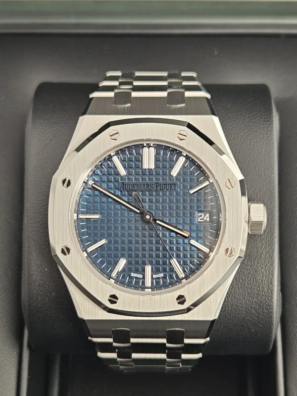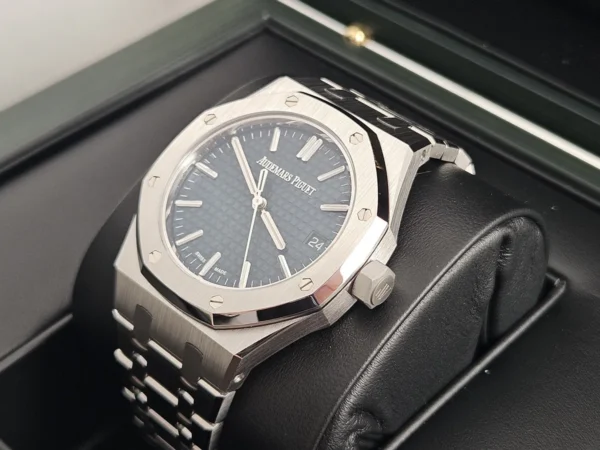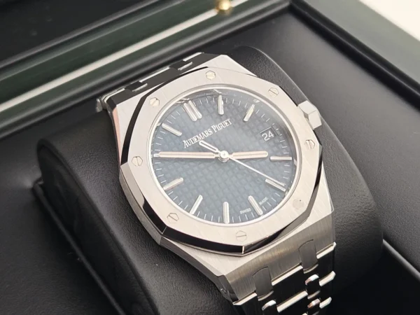 El Audemars Piguet Royal Oak 15550ST en Acero es compacto, potente y atemporal. En un formato de 37 mm, mantiene la icónica esfera azul Tapisserie. Impulsado por el calibre automático 5900. Se entrega Full Set (caja y documentación) y en estado excelente. Disponible en Watch Ocasion.