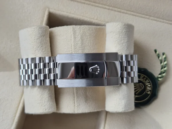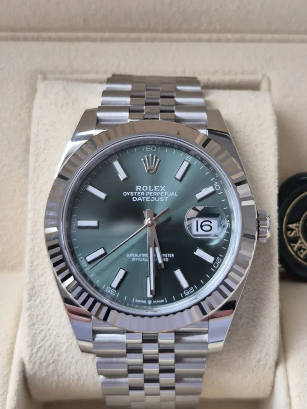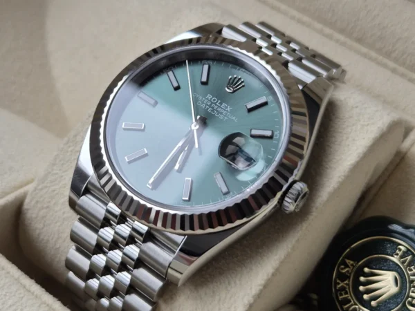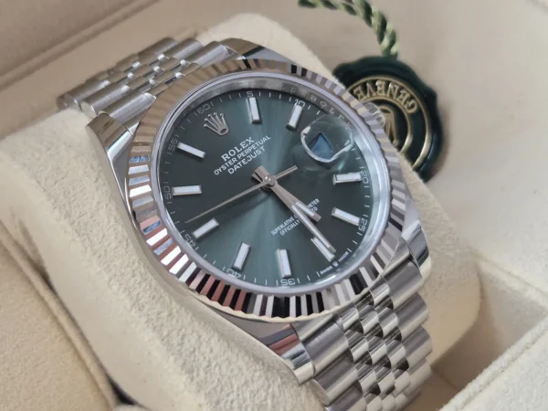 El Rolex Datejust 41 126334GR combina Acero y oro blanco 18k. Su esfera verde oliva con índices aplicados, bisel estriado de oro blanco y brazalete Jubilee con cierre oculto lo hacen único. Impulsado por movimiento automático. Se entrega Full Set y en estado impecable. Un Rolex que impone sin alzar la voz, disponible en Watch Ocasion.