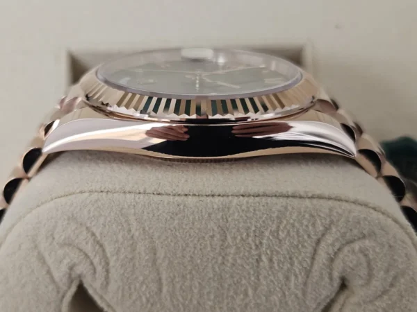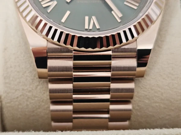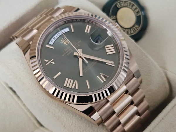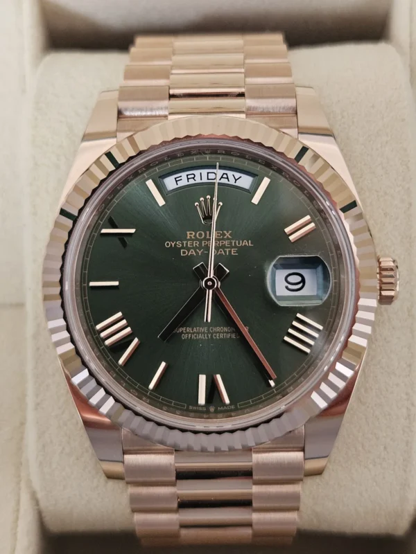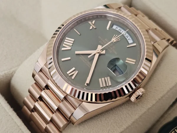 El Rolex Day-Date 40 228235OL en Oro Everose 18k es exclusividad con nombre propio. Cuenta con dial verde oliva e índices romanos, y bisel estriado. Impulsado por el calibre 3255 con funciones de Día + fecha. Se entrega Full Set y en estado excelente. Disponible en Watch Ocasion.