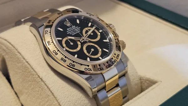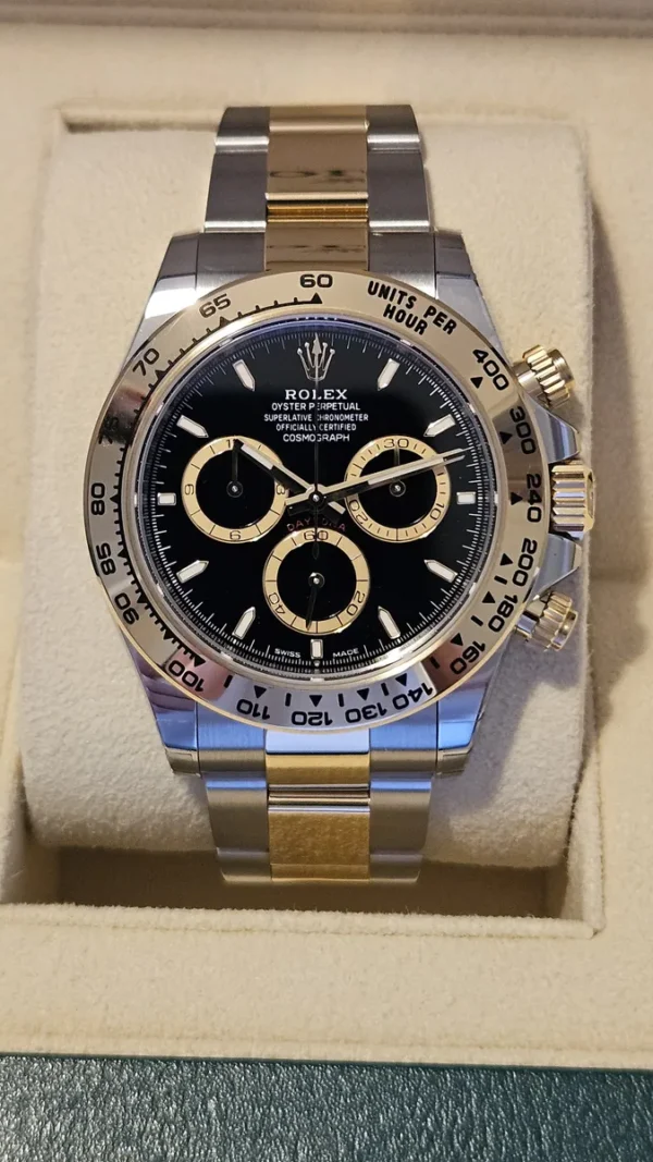 El Rolex Daytona 126503 combina Acero y oro amarillo 18k. Presenta una esfera negra con subesferas doradas y bisel de oro con escala taquimétrica. Impulsado por el calibre automático 4131. Se entrega Full Set y en excelente estado. Un clásico con presencia moderna, disponible en Watch Ocasion.