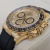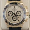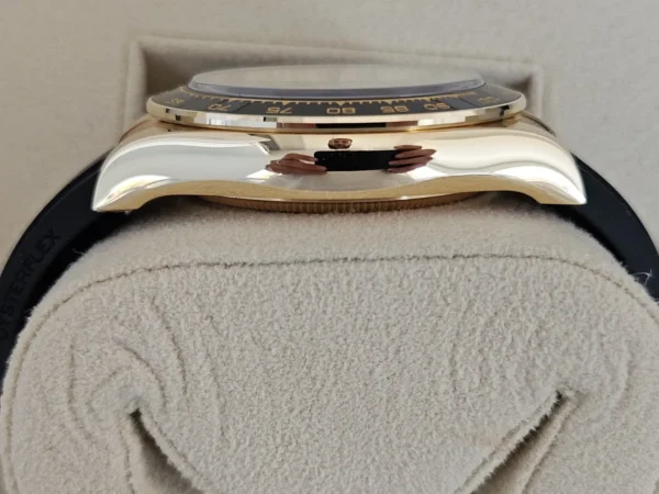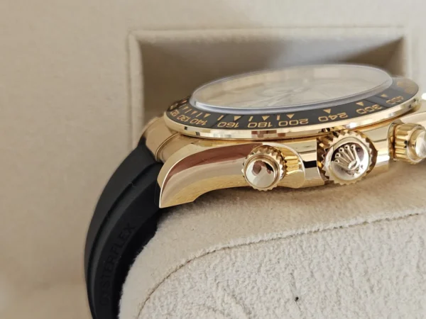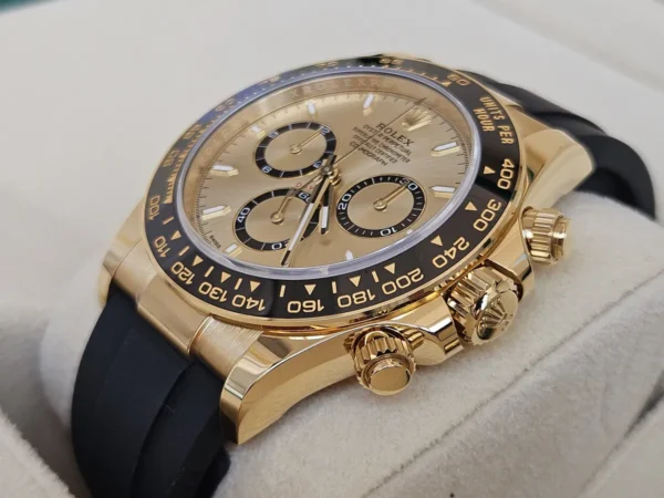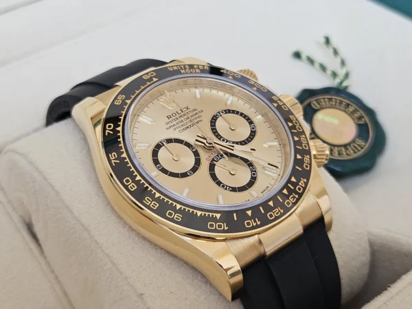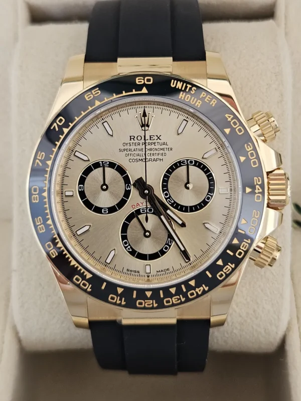 El Rolex Daytona 126518 en Oro amarillo 18k presenta una esfera champagne con subesferas negras y correa Oysterflex para alta comodidad. Impulsado por el calibre automático 4131. Se entrega Full Set y en estado como nuevo. Presencia y flexibilidad en una sola pieza, disponible en Watch Ocasion.