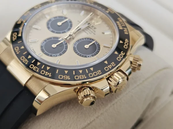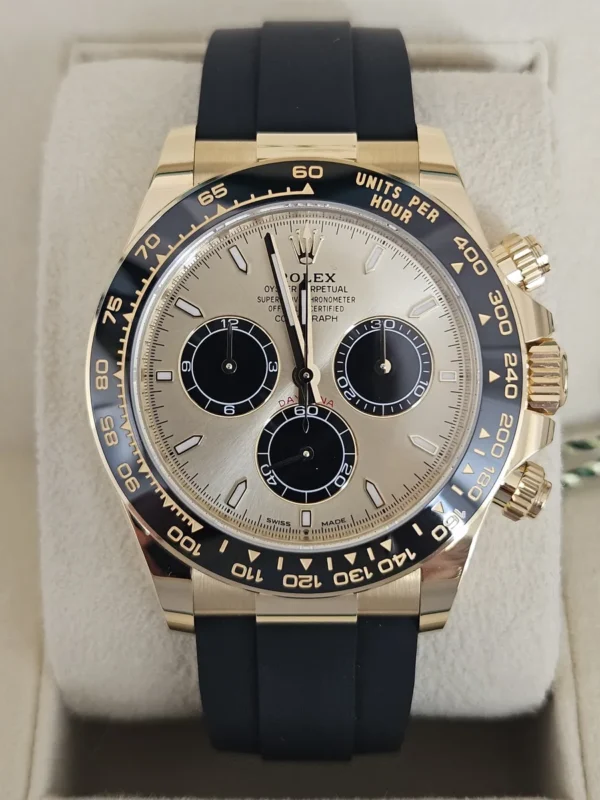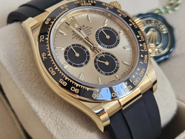 El exclusivo Rolex Daytona 126518 ‘Pika’ en Oro amarillo 18k cuenta con un dial champagne con contadores negros y correa Oysterflex de goma técnica. Impulsado por el calibre automático 4131. Se entrega Full Set y en estado perfecto. Exclusivo, cómodo y brillante, disponible en Watch Ocasion.