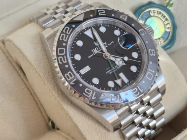 El Rolex GMT-Master II 126710GRNR en Acero Oystersteel cuenta con bisel cerámico gris/negro Cerachrom y brazalete Jubilee con cierre oculto. Impulsado por el calibre 3285 con función GMT. Se entrega Full Set y en estado impecable. Lo nuevo de Rolex, difícil de ver, disponible en Watch Ocasion.