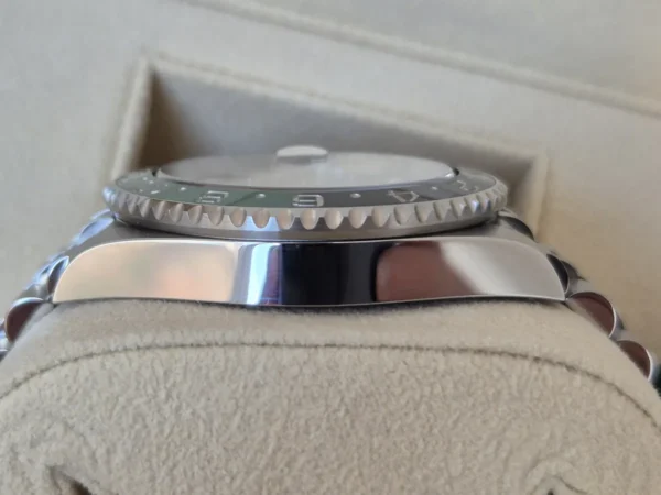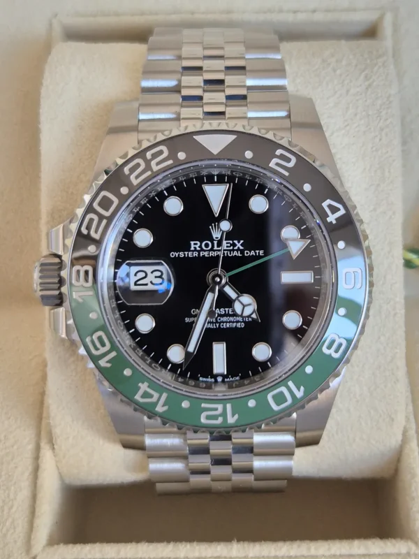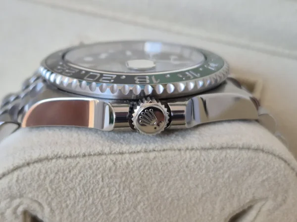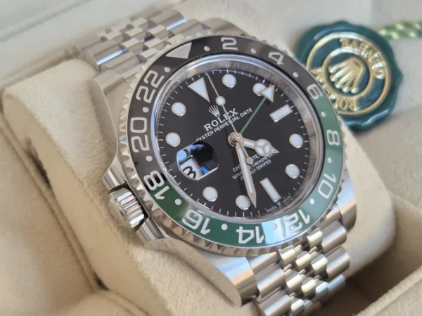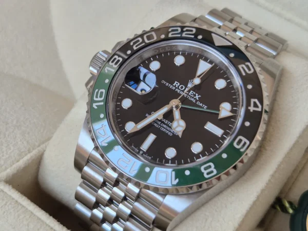 El Rolex GMT-Master II 126720VTNR “Lefty” en Acero Oystersteel presenta un bisel cerámico negro/verde “Sprite” y brazalete Jubilee con cierre oculto. Su corona está a la izquierda. Impulsado por el calibre 3285 con función GMT y fecha. Se entrega Full Set y en estado como nuevo. Pieza diferente, difícil de ver, disponible en Watch Ocasion.