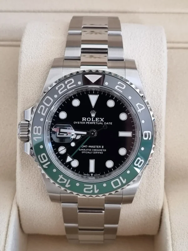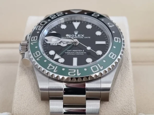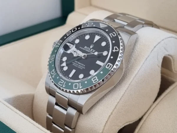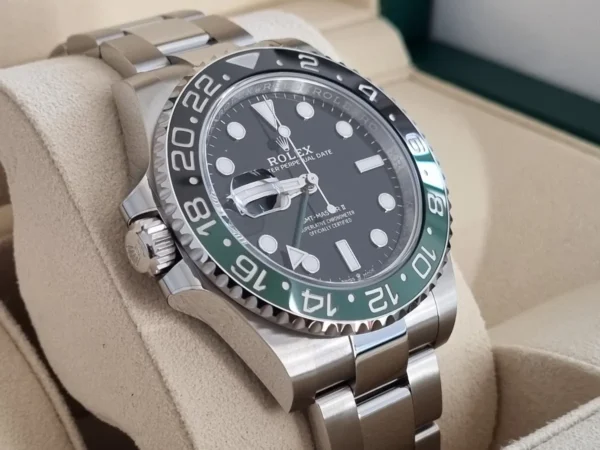 El Rolex GMT-Master II 126720VTNR “Lefty” en Acero de 40 mm cuenta con bisel verde/negro Cerachrom y brazalete Oyster con cierre robusto. Su corona está invertida. Impulsado por el calibre 3285 automático. Se entrega Full Set y en estado perfecto. Diseño poco común, ADN 100% Rolex, disponible en Watch Ocasion.