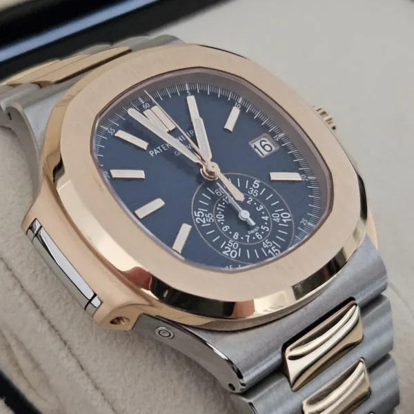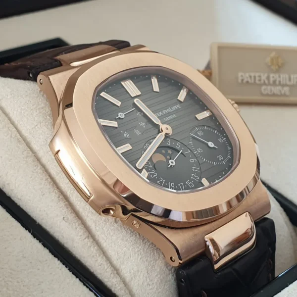 El Nautilus más elegante. Caja en oro rosa, correa de piel, complicaciones útiles. Sofisticación con sello Patek.